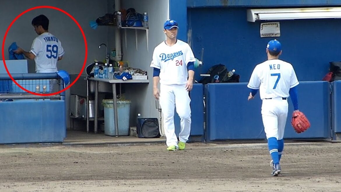 トレード6日前の山本拓実、降板する根尾昂へタオルと飲料水を届ける(2023年6月13日)