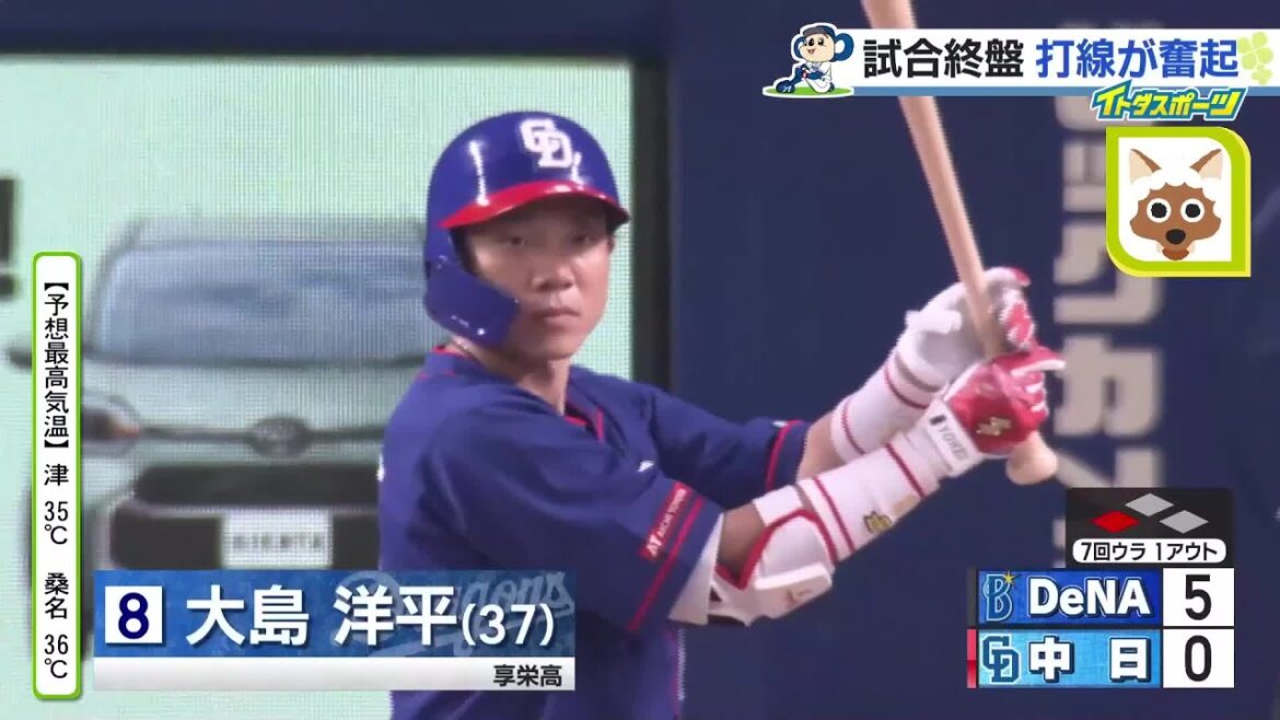 6月28日以来となるタイムリーで1点を返すと、6番大島洋平がこの試合2本目となる犠牲フライで5対3。徐々に点差を詰めていきます。