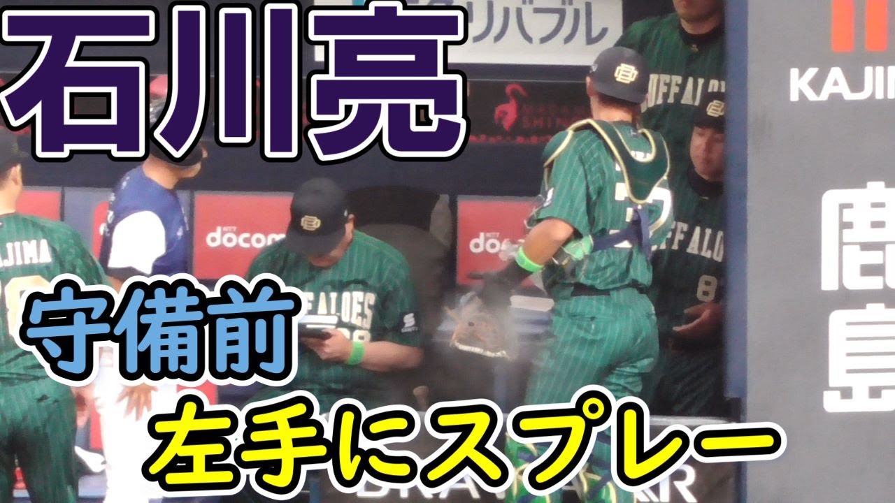 石川亮選手が守備に就く前に左手(グローブ)に滑り止めスプレーを吹きかけるのを撮影しました。前回見た時よりもかなり多く吹きかけてたと思います。