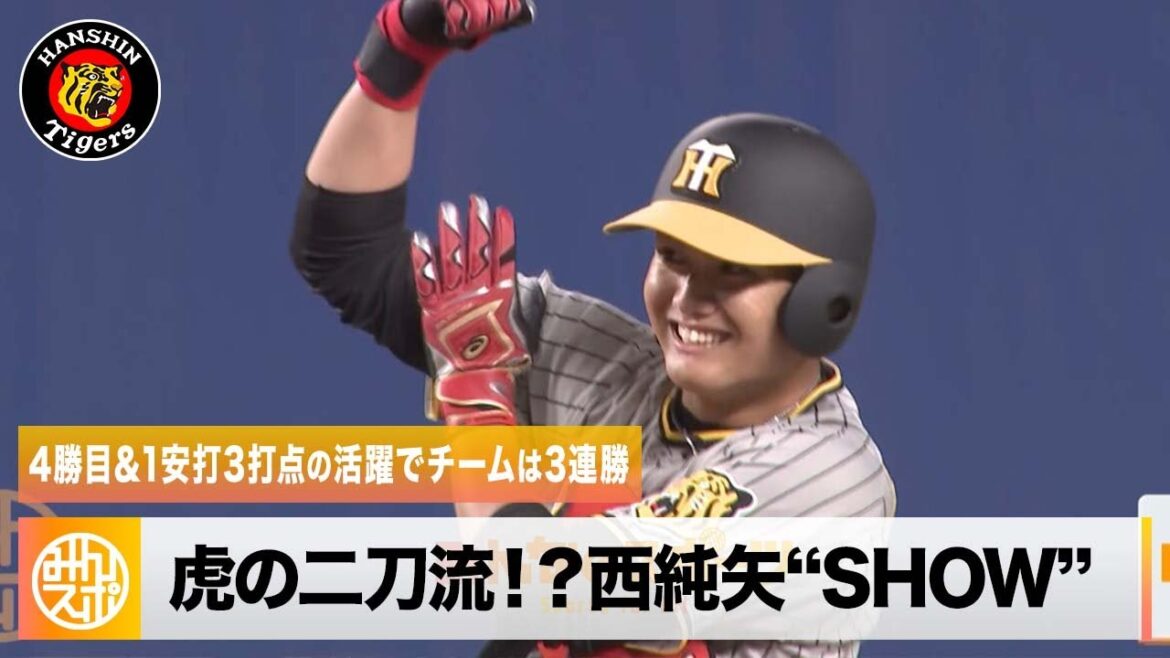 首位阪神は6回に1点を勝ち越し3対2でさらに満塁のチャンス。打席に迎えるは、ピッチャーながら得点圏打率3割を超える西純矢(23)。野手顔負けのバッティングは、走者一掃のタイムリー2ベース。自らを援護する。