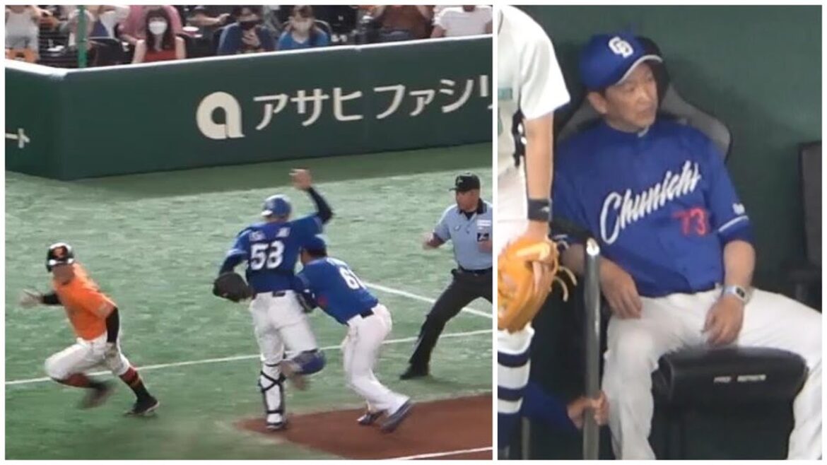 挟殺プレーで石橋と福永が交錯。一死2.3塁となり直後に痛すぎる5点目を失ったシーン(2023年7月29日)