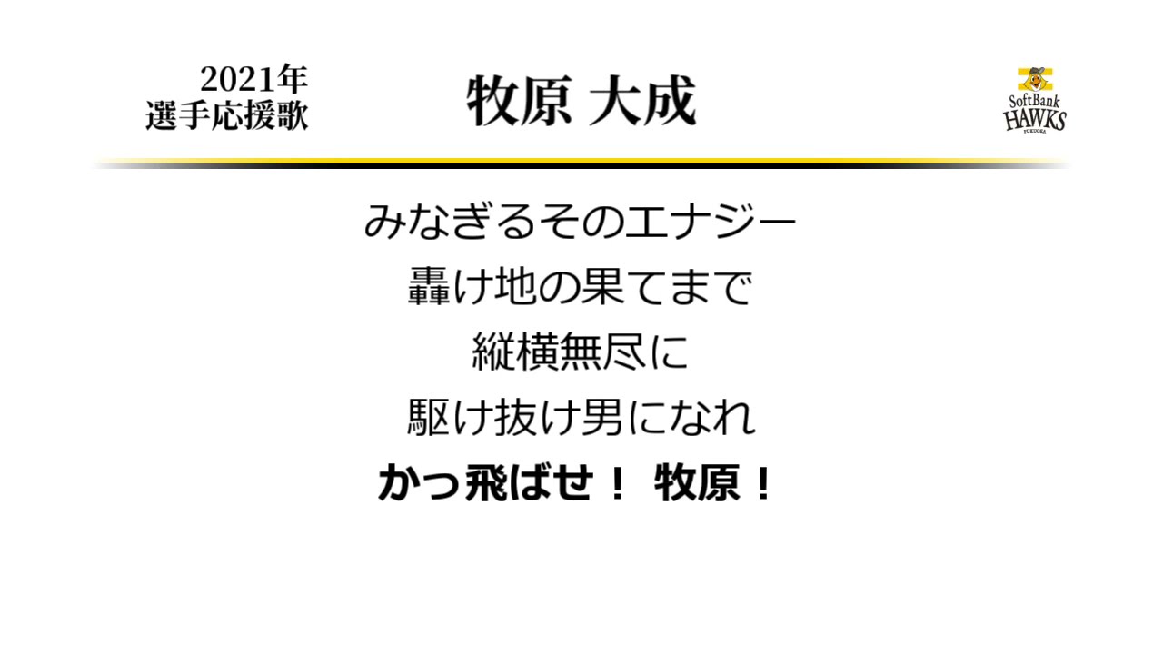 ソフトバンク牧原大成選手の応援歌です。 今年から牧原が2人になりましたが、選手コールは今のところ牧原のままの模様。 応援歌CDだと球場演奏よりも1音高いキーで収録されているせいもあって、 女声がすごい苦しげな感じで歌っている応援歌。 Fukuoka SoftBank HawksFukuoka SoftBank Hawks (Baseball Team)Taisei Makihara (Baseball Player)なんぶふじ応援歌牧原大成福岡ソフトバンクホークス NPBHUB.COM | The Fanbase of Nippon Baseball & Nippon Professional Baseball