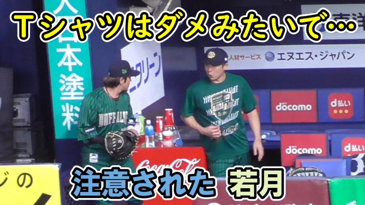 夏の陣Tシャツでベンチ前キャッチボールをしようとした若月健矢選手ですが、コーチ陣から注意されて小田裕也選手と替わっていました。かつてアダムジョーンズも夏の陣Tシャツでイニング間キャッチボールをして審判から注意されていました。