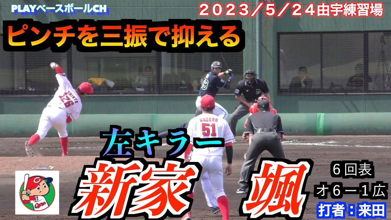 【左キラー】新家颯投手(広島東洋カープ)の投球!2アウトランナー2塁の場面で来田選手を三振でピンチを抑える!【2023/5/24@由宇練習場】