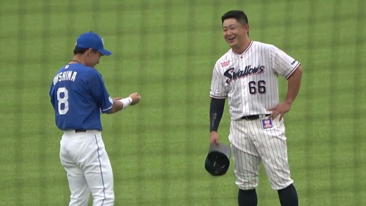 中日・大島洋平選手、元同僚のヤクルト・三ツ俣大樹選手と談笑