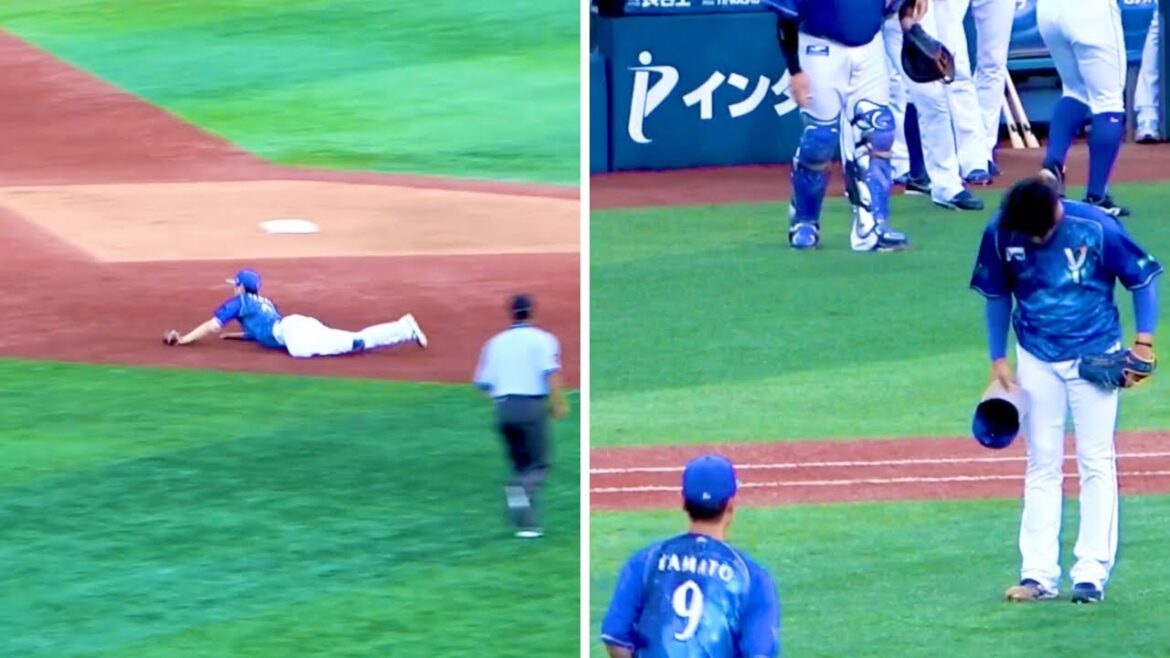 大和のダイビングキャッチに頭を下げて礼を伝える上茶谷大河 横浜DeNAベイスターズ 2023/8/5