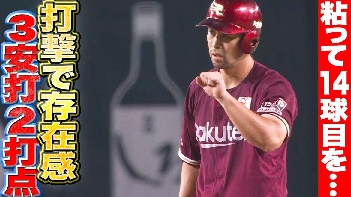 4回表にレフト前ヒットを放った東北楽天・阿部寿樹。6回表の打席では粘りに粘って14球目を左中間へ。お酒に当てるところはさすが。9回表にもタイムリーを放ち、渋くしぶとい打撃で3安打2打点。連日の躍動で勝利へ導く活躍を見せた。