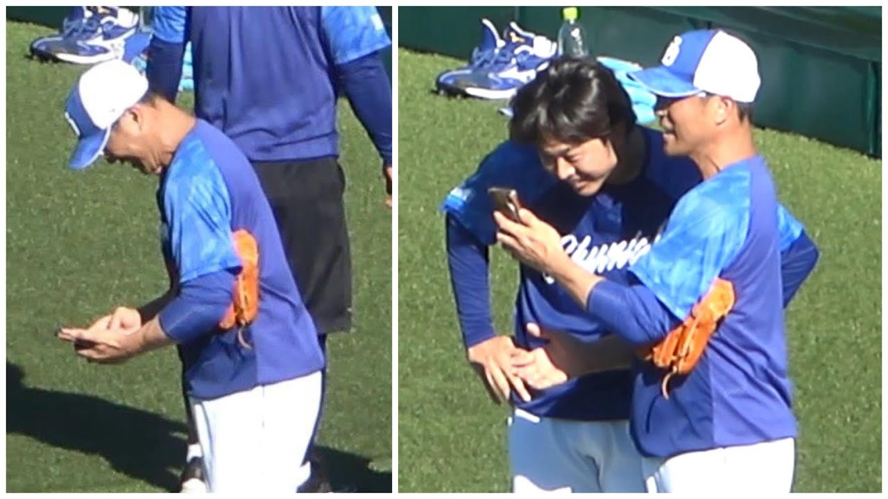 スマホの画面を見てひとりニヤつく大塚コーチ。その画面を見た高橋宏斗…大爆笑(笑)(2023年7月16日)