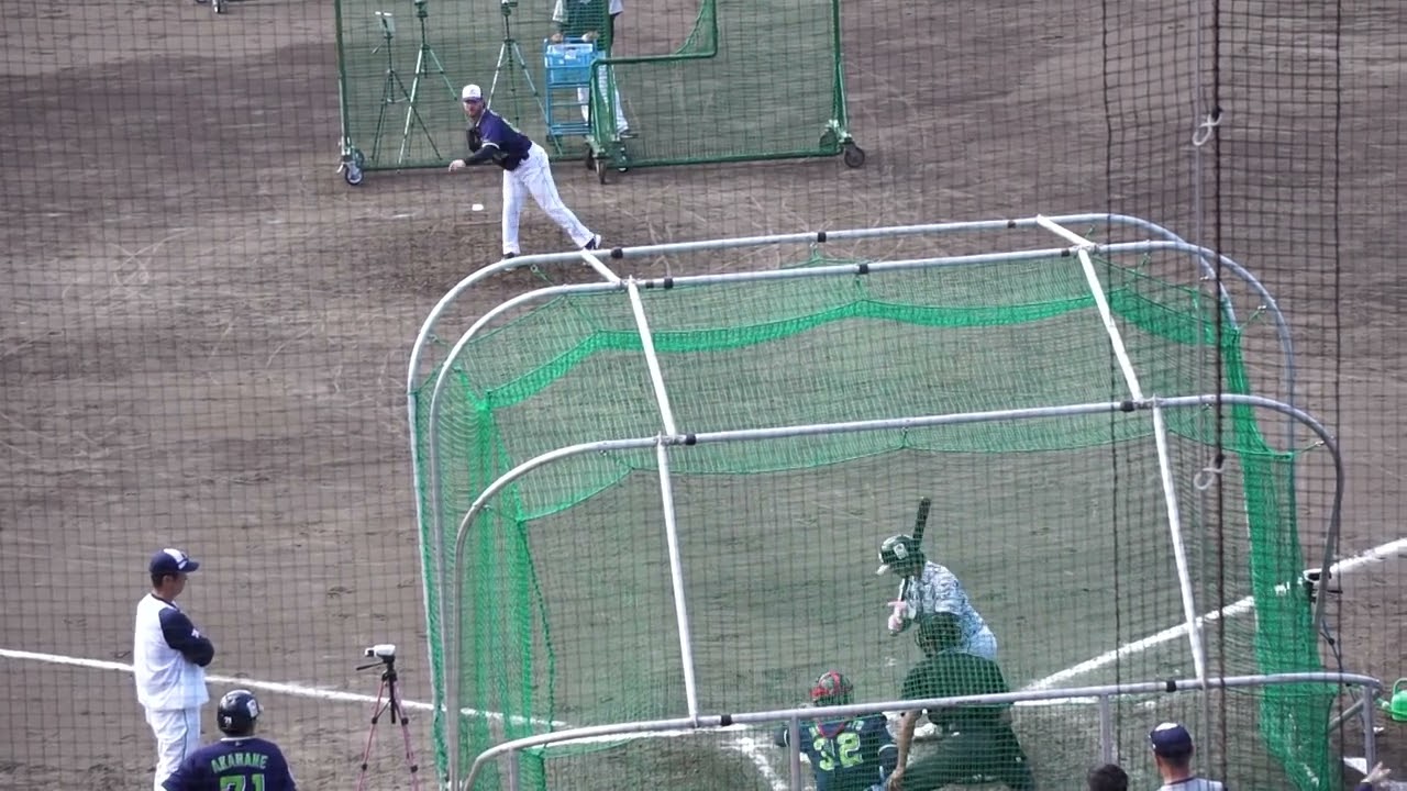 キャンプ中 ライブBPで登板するD.ピーターズ投手、打席に立つ岩田幸宏選手(東京ヤクルトスワローズ)。