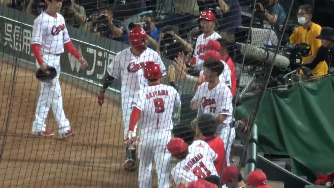 中盤に貴重な追加点!満塁のチャンスに代打の神様 松山竜平が犠牲フライを打ち上げる!
