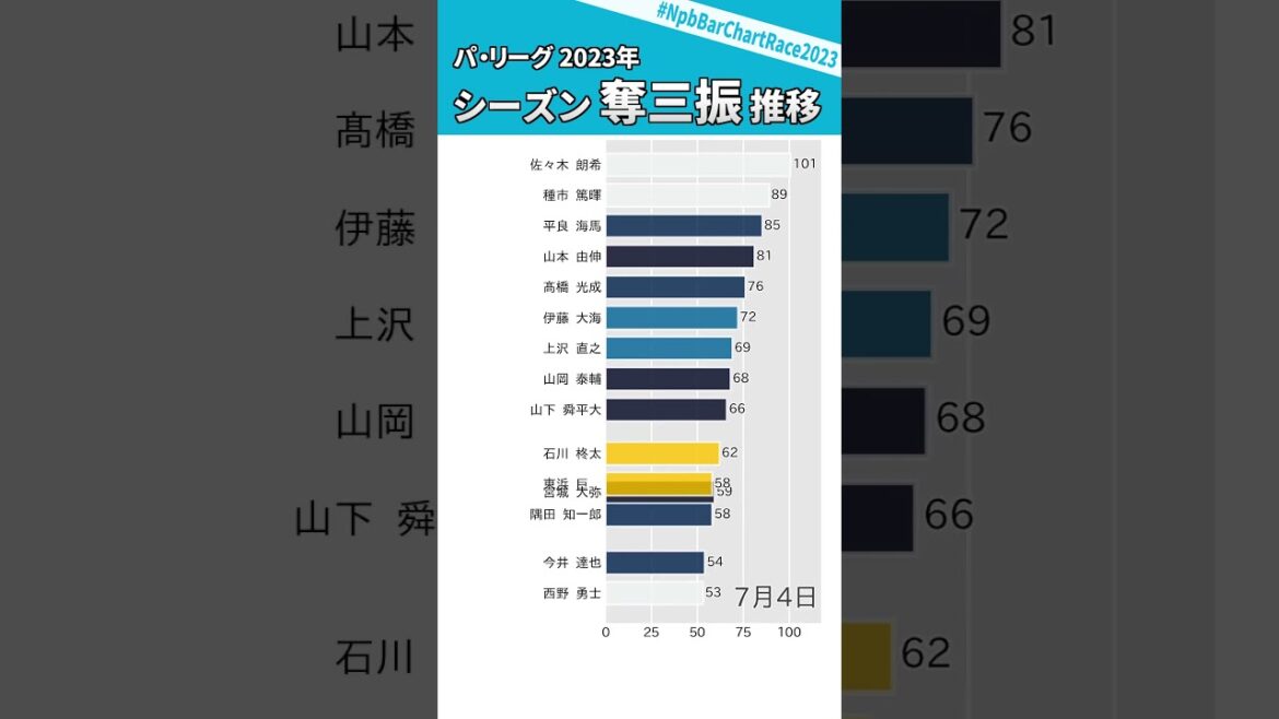 📊佐々木朗希独走ならず・・・2023年シーズン パ・リーグ奪三振推移(8月12日まで)⚾#NpbBarChartRace2023