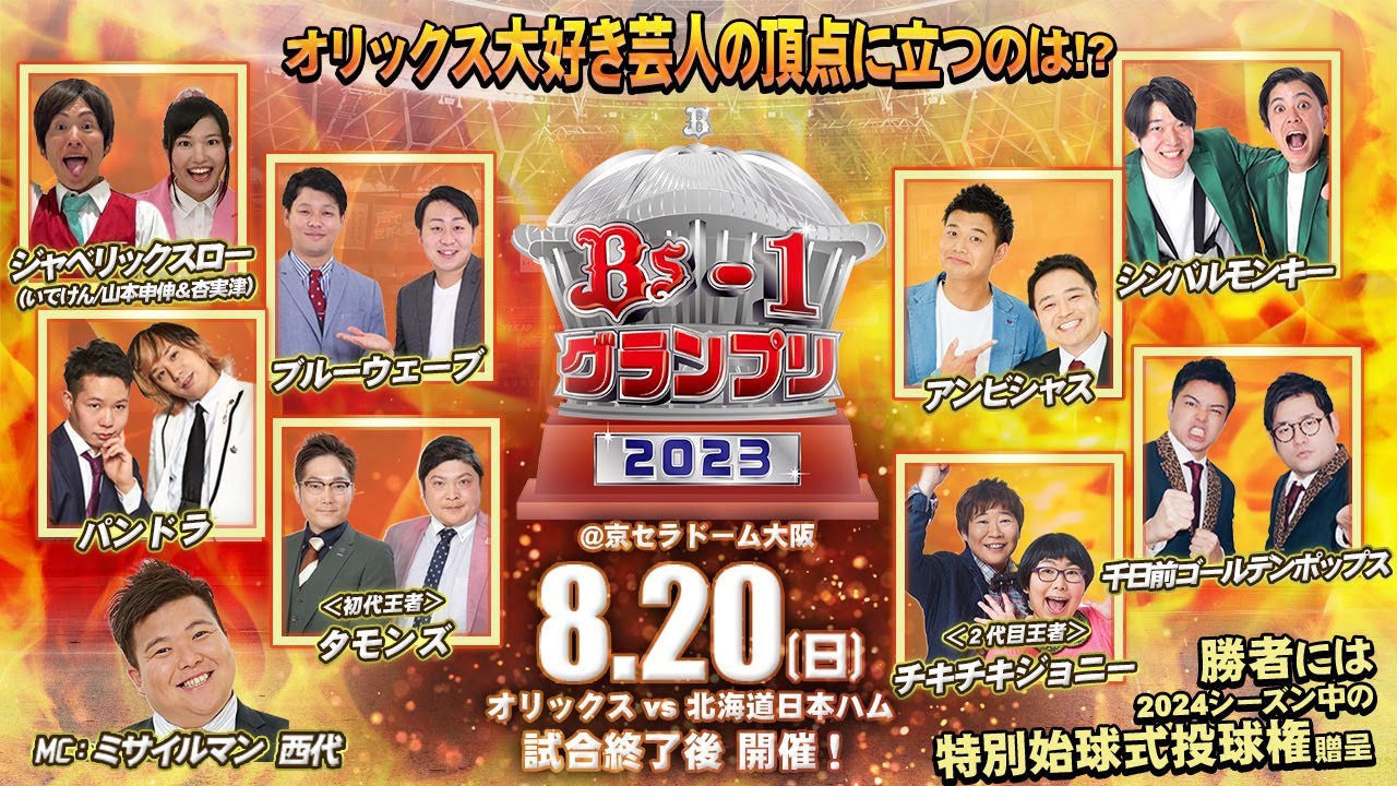 8月20日(日)試合終了後に「第3回Bs-1グランプリ」を開催いたします。オリックス大好き芸人たち8組によるネタバトル!当日はファン投票にて「3代目王者」を決定いたします!頂点を掴むのはどの芸人か?!ぜひお見逃しなく!