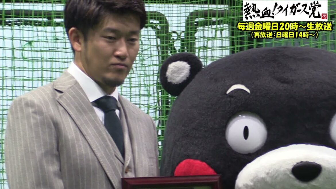 継続的な社会貢献やファンサービスに取り組む選手を阪神タイガースが球団として表彰する若林忠志賞。本年度は熊本地震の復興支援でふるさとの少年野球チームにボールを寄贈している岩貞祐太投手が受賞し、記念の盾や活動資金などが贈られました。授賞式には熊本県のマスコットキャラクターのくまモンがサプライズで登場しました。(2021年12月10日OA)