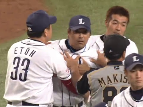 7日の試合での4死球を伏線に、8回の佐藤への内角攻めに対して、埼玉西武・小野投手コーチと北海道日本ハム・清水一塁コーチのあわや乱闘という一触即発のシーン(2009年7月9日 埼玉西武ライオンズ対北海道日本ハムファイターズ) 0709200907097/97月9日fightersHokkaido Nippon-Ham Fighterslionsseibuデッドボールファイターズライオンズ乱闘佐藤友亮北海道日本ハムファイターズ危険危険球埼玉西武ライオンズ小野コーチ怒る日ハム日本ハム梨田監督死球清水優心渡辺監督激怒珍プレー西武西武ドーム NPBHUB.COM | The Fanbase of Nippon Baseball & Nippon Professional Baseball
