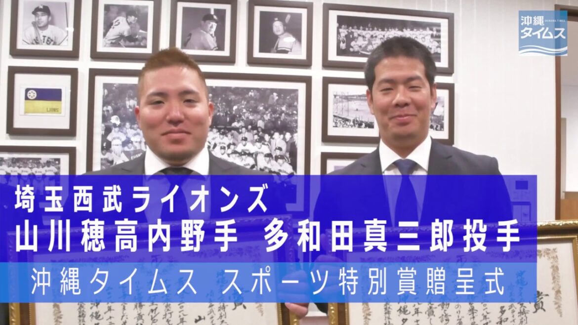 沖縄タイムス社(武富和彦社長)は21日、プロ野球パ・リーグの埼玉西武ライオンズに所属し、今季のリーグ本塁打王を獲得した山川穂高内野手(27)=那覇市出身=と、最多勝利投手に輝いた多和田真三郎投手(25)=中城村出身=に「沖縄タイムス特別スポーツ賞」を贈呈した。