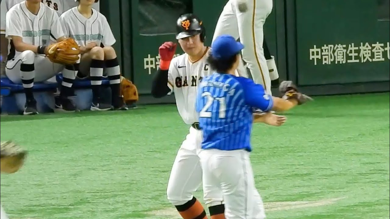 【参りました】 チャンスでピッチャーフライに討ち取られた岡本和真、一瞬笑みを浮かべて今永に会釈をする 2023.7.7