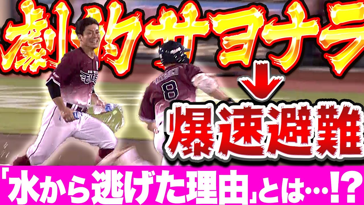 10回裏、東北楽天・辰己涼介がレフトオーバーのサヨナラタイムリー!! この劇的一打に歓喜の瞬間…!!と思いきや、辰己涼介は走塁よりも速い可能性まである爆速避難。水から爆速で逃れた理由とは。編集部内の予想は『前世がなめくじだった…?』『水で顔が濡れると力が出なくなるあの国民的アニメの主人公…?』などのボケのような予想が飛び交いましたが、真実は…!!