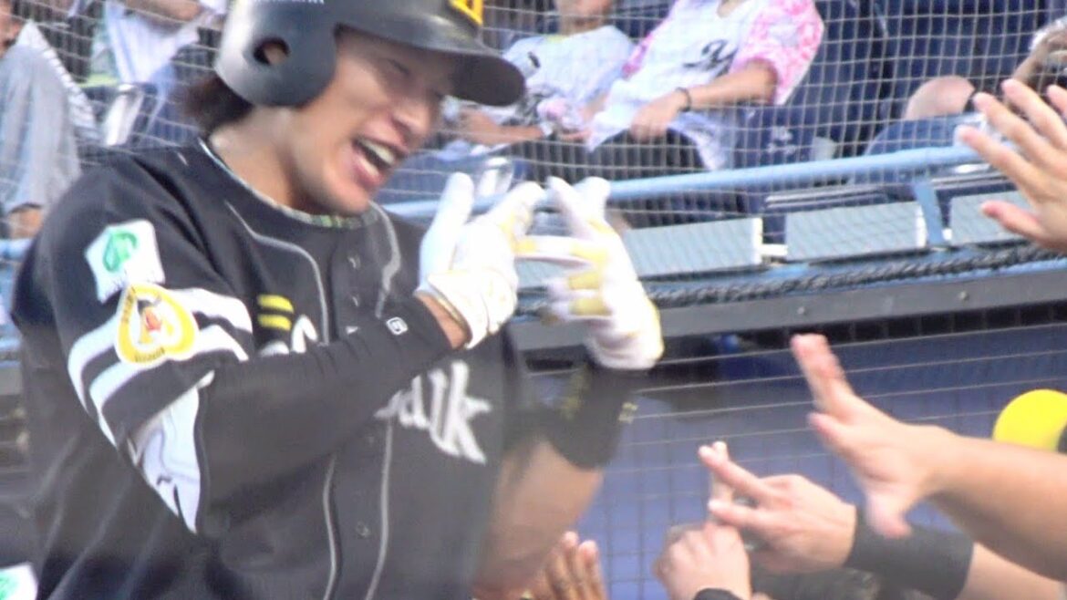 柳田悠岐選手がライトへ先制3ランホームランを放つ
