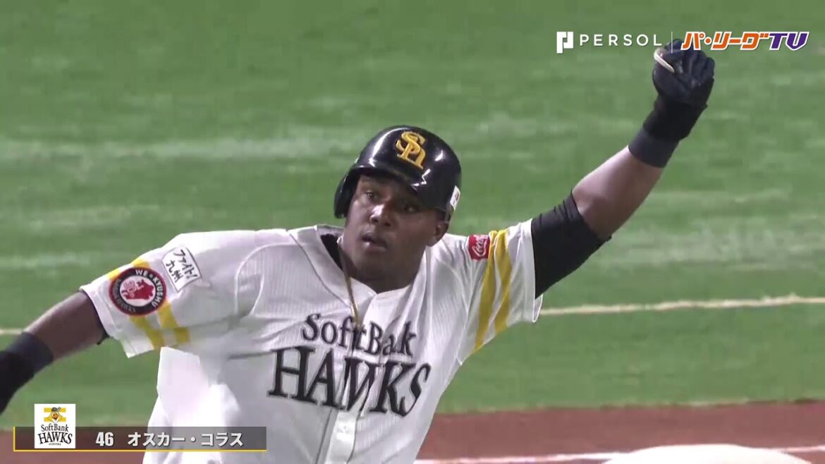 福岡ソフトバンク・コラスは1軍に昇格即スタメン。迎えた第1打席の初球をはじき返すと、右中間スタンドテラス席へ!! 左腕を高々と上げ、衝撃のデビューを飾った。