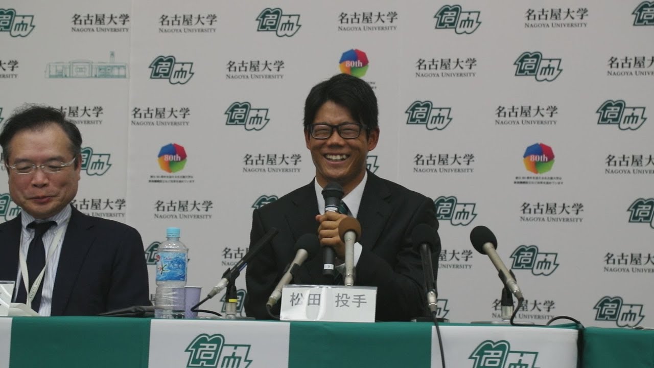 ドラゴンズに育成1位に指名された名古屋大学の松田選手の記者会見の様子です。