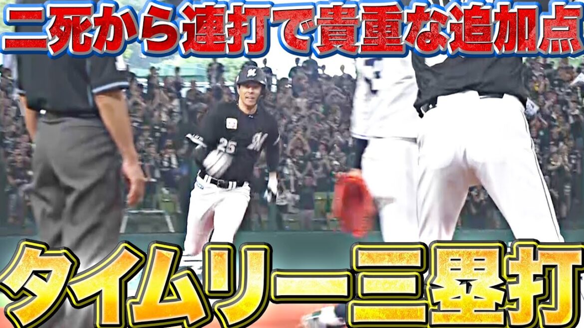 3点リードの6回表。2アウトから千葉ロッテ・ブロッソーがヒットで出塁すると、続く岡大海がライトへタイムリー3ベースヒットを放ち追加点。