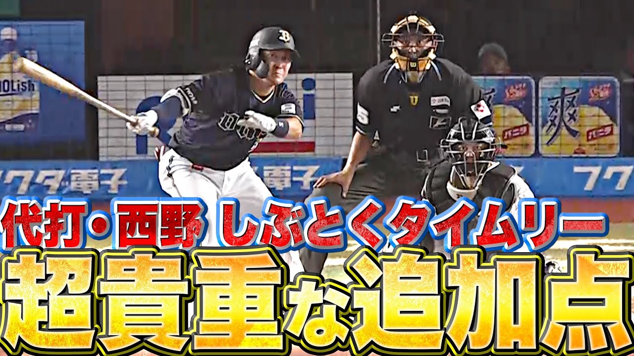 1点リードで迎えた7回表。オリックスが2アウトながらも1,2塁のチャンスを作ると、代打の西野真弘がバットの先でセンター前へ運び、追加点となるタイムリーヒット。