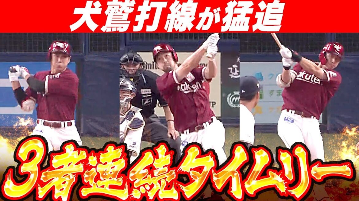 5点ビハインドの4回表、東北楽天の攻撃。岡島豪郎、阿部寿樹、辰己涼介の3者連続タイムリーで3点を返し、犬鷲打線が反撃を開始しました!!