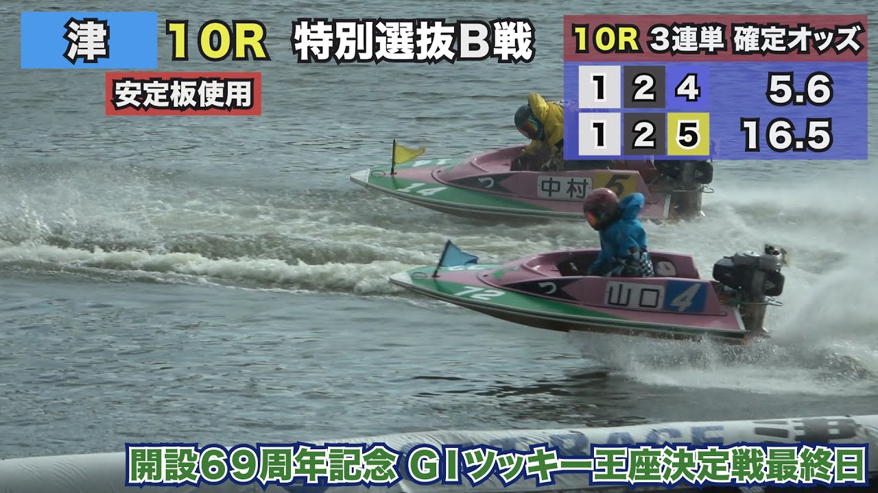 撮影したこの日は1日を通じて風が強く、1R~12Rまで安定板を使用していますが、この10R特別選抜B戦から競走水面が少し落ち着いてきたことによって周回短縮がなくなり、本番レースはここから通常の3周で行われました。