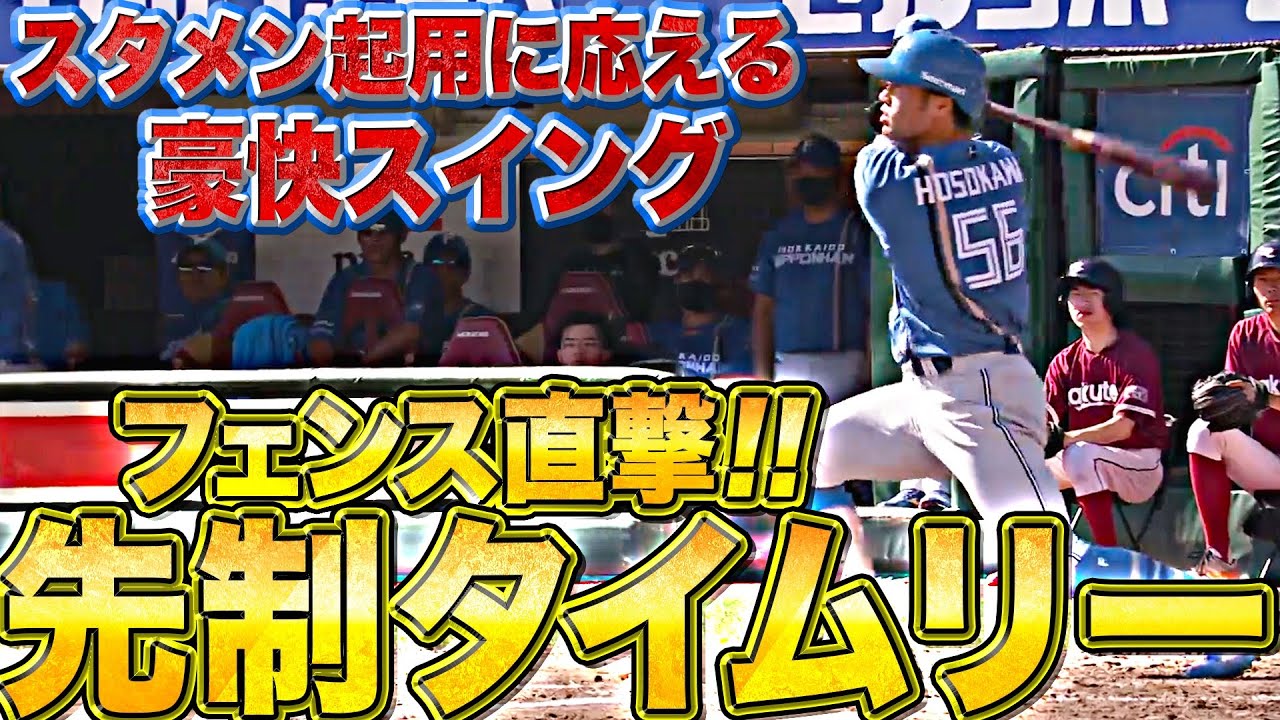 同点の3回表に北海道日本ハム・細川凌平が右中間フェンス直撃のタイムリー2ベースヒット。