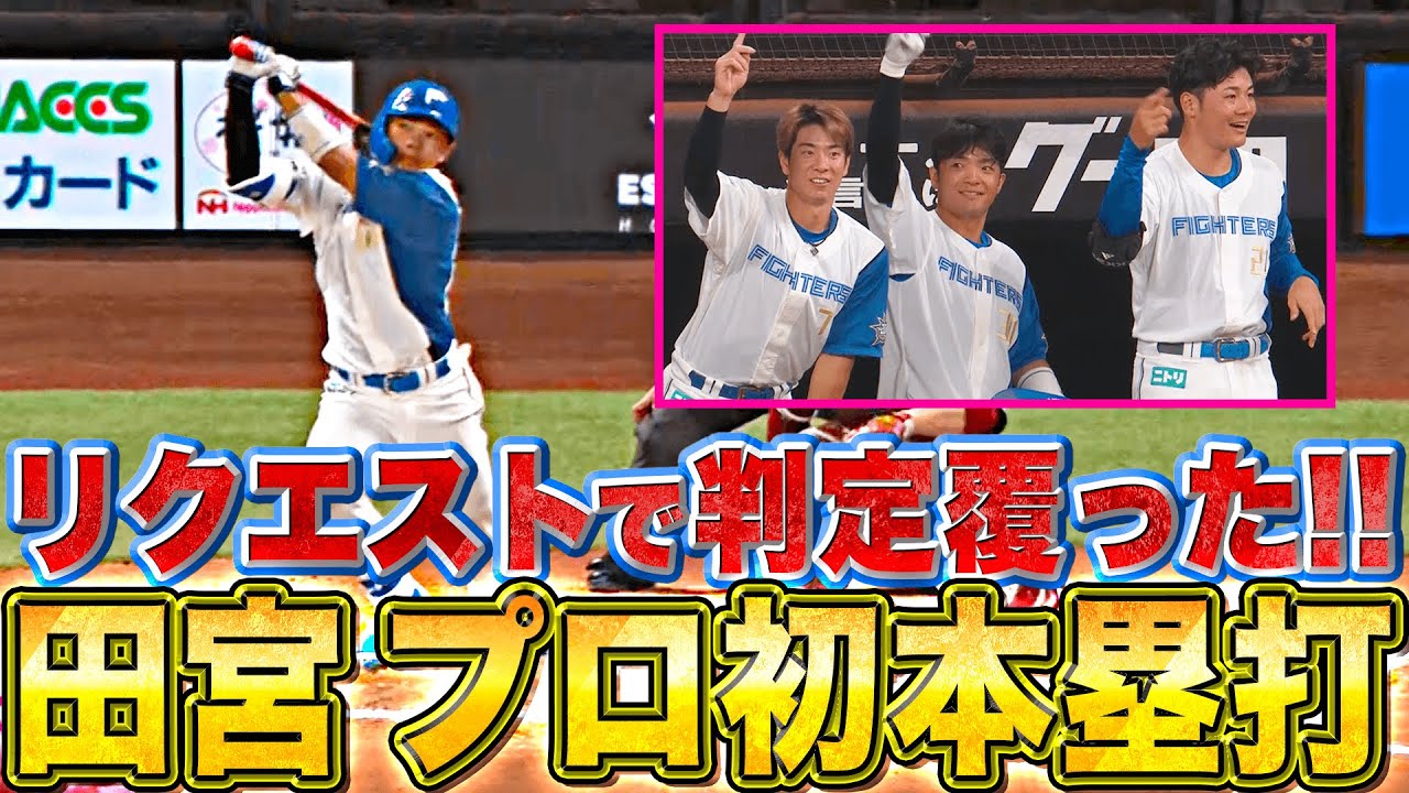 北海道日本ハム・田宮裕涼のフェンス直撃の2ベースヒット!!!! ん?これ当たった場所って…ベンチもお客さんもぐるぐる手を回して…リプレイ検証!! その結果は…ホームラン!!!! 高卒5年目、嬉しい嬉しいプロ初ホームランとなりました!!!