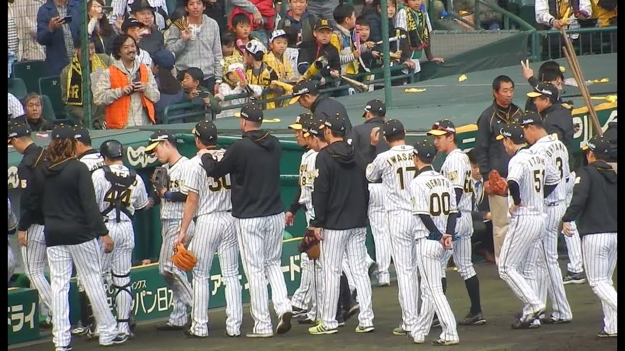 試合終了後のベンチ前のハイタッチの様子です。 岩貞投手が色々な人から握手を求められていたり 見ていると色々ありますが、 メッセンジャー投手は石崎投手の肩をもんでいます。 大量点に守られて完勝でしたが 最後の1イニングを任された石崎投手は乱調で2失点でした。 おそらくそれに対してのお疲れ様という感じなのでしょうか? (甲子園 T8-S3) Chiba Lotte Marinesfisntigersfsgroupランディ・メッセンジャー千葉ロッテマリーンズ甲子園石崎剛試合終了後阪神タイガース NPBHUB.COM | The Fanbase of Nippon Baseball & Nippon Professional Baseball