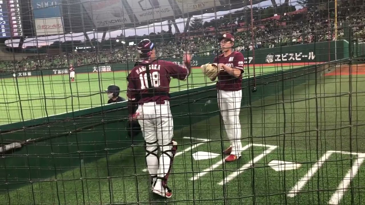 プロのブルペンでの様子!ベルーナドーム(西武)のフィールドビュー席でブルペン投球を真後ろから撮影!楽天イーグルスの高田 孝一投手!ブルペン終了後にブルペンキャッチャーと意見交換!