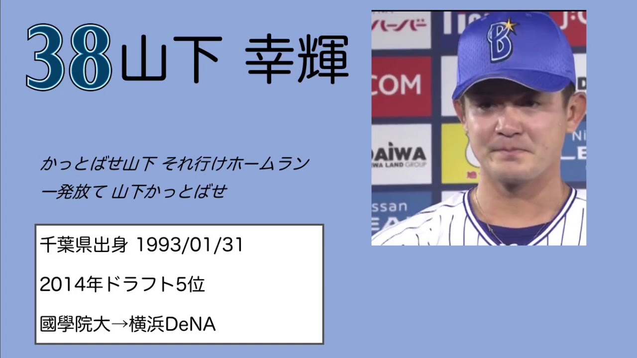 2018年6月12日の千葉ロッテ戦からオールスターまでの期間中に使用されることが決まりました。 応援歌は山下大輔選手の流用です。 オールスター以降も継続して使われるようです。 追記(2019年3月2日) 2019シーズンの使用はなく左打者汎用曲を用いる模様です。 楠本選手、佐野選手につきましても同じ扱いになります。 訂正 かっとばせ山下 かっとばせ山下 かっとばせ山下 山下かっ飛ばせ になります。 YOKOHAMA DeNA BAYSTARS山下幸輝横浜DeNAベイスターズ NPBHUB.COM | The Fanbase of Nippon Baseball & Nippon Professional Baseball