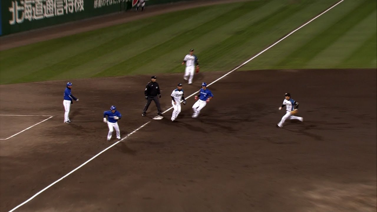 6回、5点のリードがあるとはいえ、無死満塁のピンチを招いてしまった日本ハム谷元。多村にタイムリーを浴び、なおも無死満塁、打席にはブランコ。ここでライトへ飛球を打ち上げたのを見た二塁走者・梶谷が何を思ったか全速力で三塁へ向かったため、狭殺プレーにもちこんで、一気に二死までこぎつける。続くラミレスも強烈な打球を放ったが、小谷野の好プレーが生まれて、最少失点で切り抜けた。 (6月3日 日本ハム-DeNA) 0603201306032013年6月3日Chunichi DragonsDeNAセパ交流戦トニ・ブランコファイターズベイスターズ中日ドラゴンズ北海道日ハム日本ハム旭川スタルヒン球場旭川市花咲スポーツ公園硬式野球場梶谷隆幸横浜珍プレー谷元圭介 NPBHUB.COM | The Fanbase of Nippon Baseball & Nippon Professional Baseball