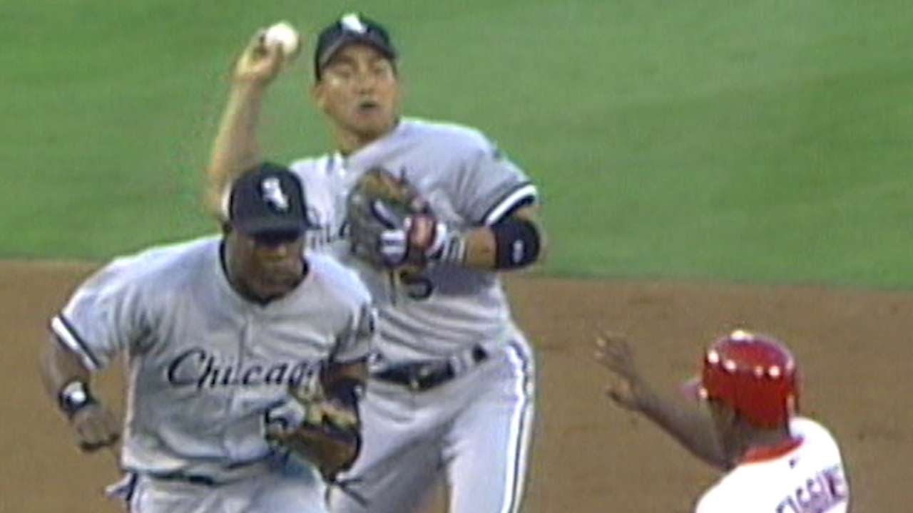 10/14/05: Tad Iguchi fields Vladimir Guerrero’s grounder up the middle, then starts a slick double play to end the 1st inning