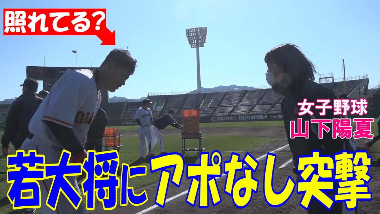 春季キャンプに参加している女子チームの山下陽夏選手、金満梨々那選手、島野愛友利選手、吉安清選手。坂本勇人選手らが調整をするS班でウォ―ミングアップをするなど一部練習メニューを男子選手ともに行っています。打撃練習では山下選手が若大将・岡本和真選手にアポなし突撃質問!