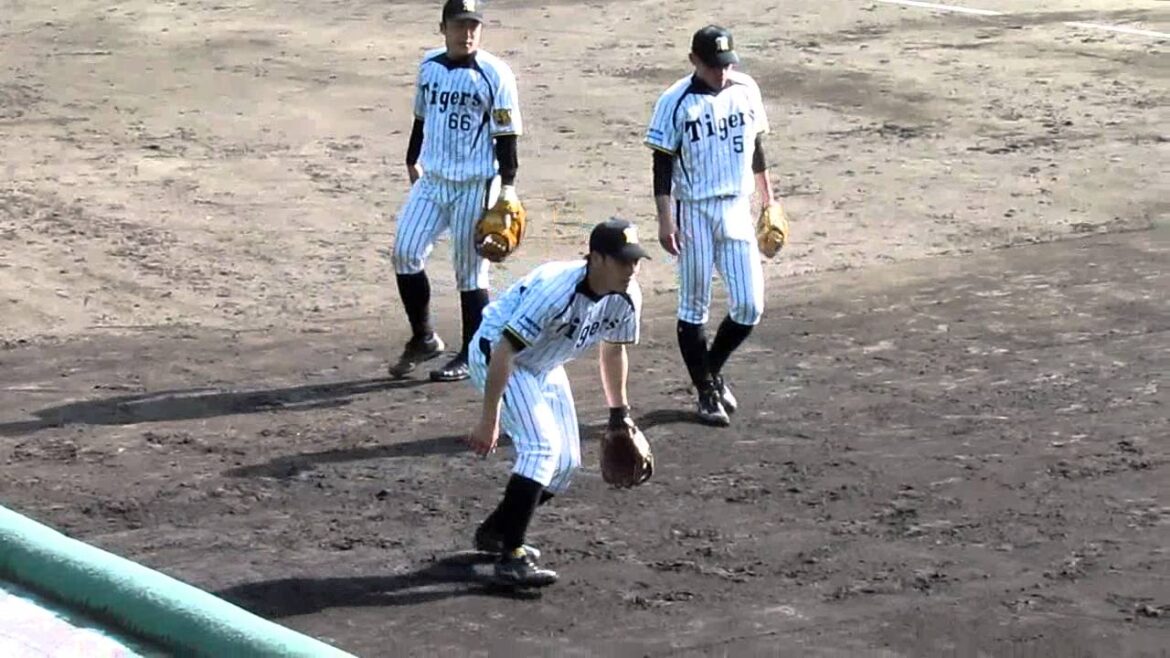 三塁側ファールグランドでのノック。一応ファーストを想定しているらしい。 Hanshin Tigersタイガース春季キャンプ 安芸橋本良平荒木郁也藤井宏政阪神タイガース NPBHUB.COM | The Fanbase of Nippon Baseball & Nippon Professional Baseball