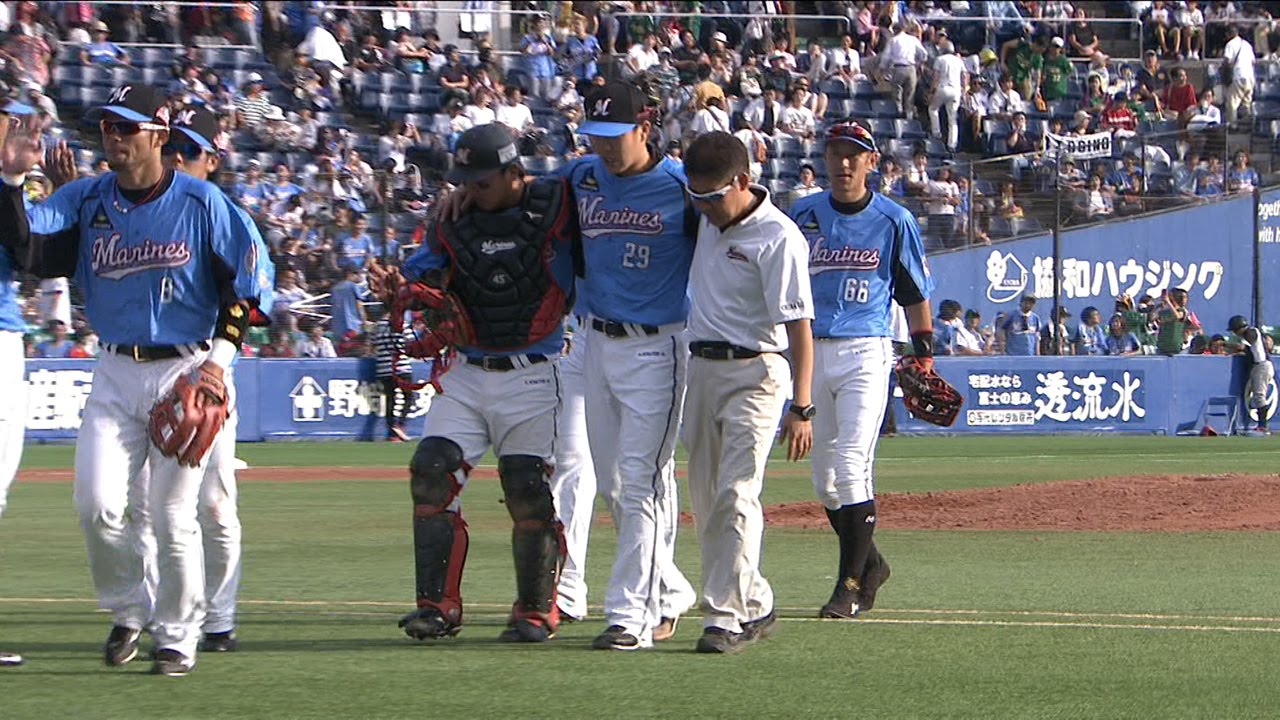 9回、ピッチャー返しの打球が西野の足を直撃。何とか一塁へ送球しゲームを締めたものの、両肩を担がれながらベンチ裏へ下がった。 (9月23日 ロッテ-楽天)