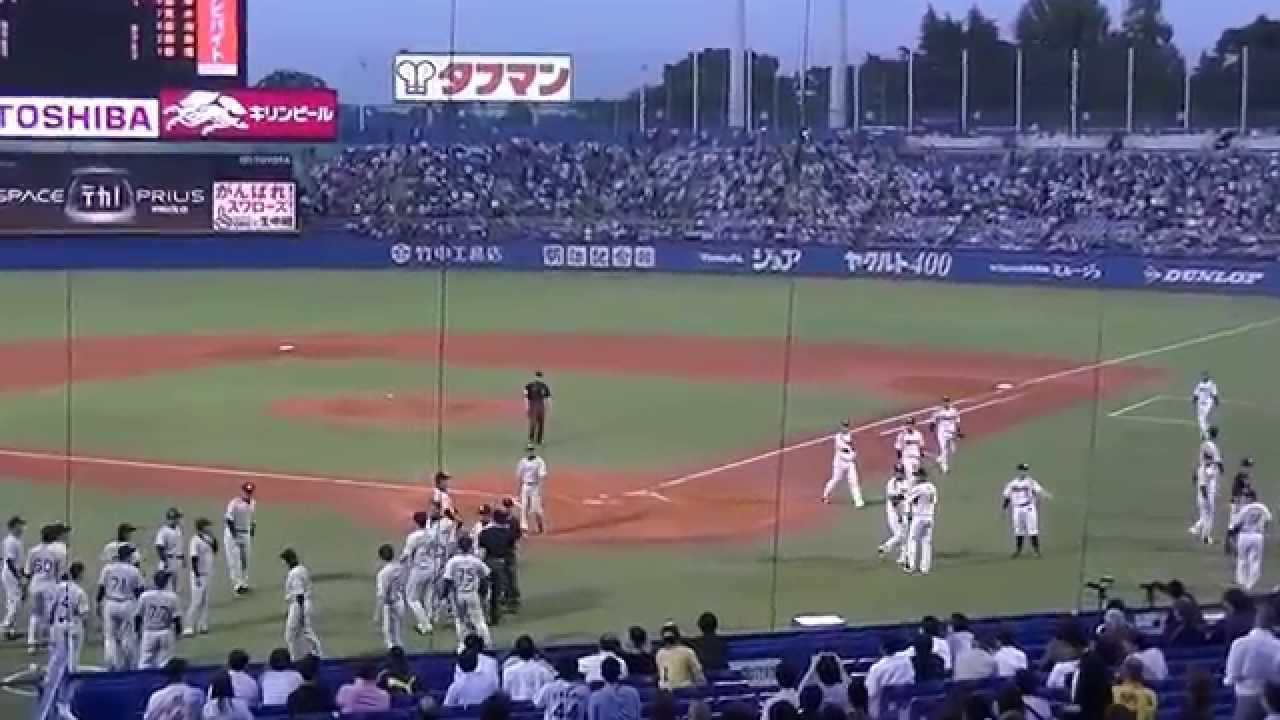 マートン西田捕手に体当たり1の直後、両軍ベンチを飛び出し、一触即発のシーンです。激突シーンは→https://youtu.be/-C-P9ri-Tv0 Tokyo Yakult Swallowsマートンヤクルトスワローズ乱闘体当たり東京ヤクルトスワローズ西田西田明央阪神タイガース NPBHUB.COM | The Fanbase of Nippon Baseball & Nippon Professional Baseball