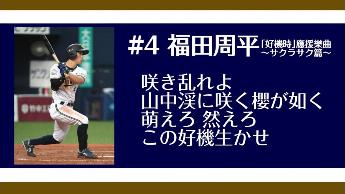「好機時」應援樂曲 ~サクラサク篇~ ~火鑽篇~に続いてチャンスver.ですね 地域密着型の応援団、紅牛會 山中渓なんて地元民以外にピンと来るんでしょうか?笑 ↓紅牛會の公式動画はこちらから ORIX Buffaloesオリックス・バファローズ福田周平 NPBHUB.COM | The Fanbase of Nippon Baseball & Nippon Professional Baseball