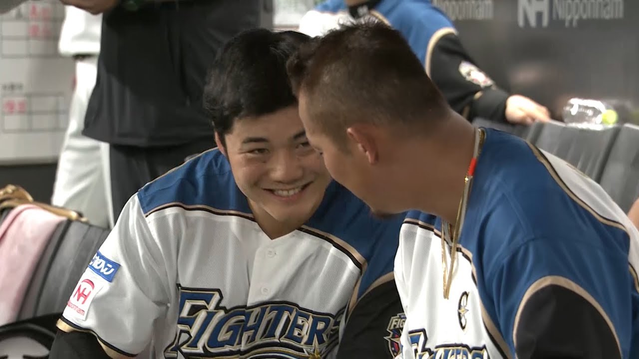 勝ち越しタイムリーを放った北海道日本ハム・清宮幸太郎。ベンチに戻ってくると、隣には中田翔が。グータッチをハニカミながら…