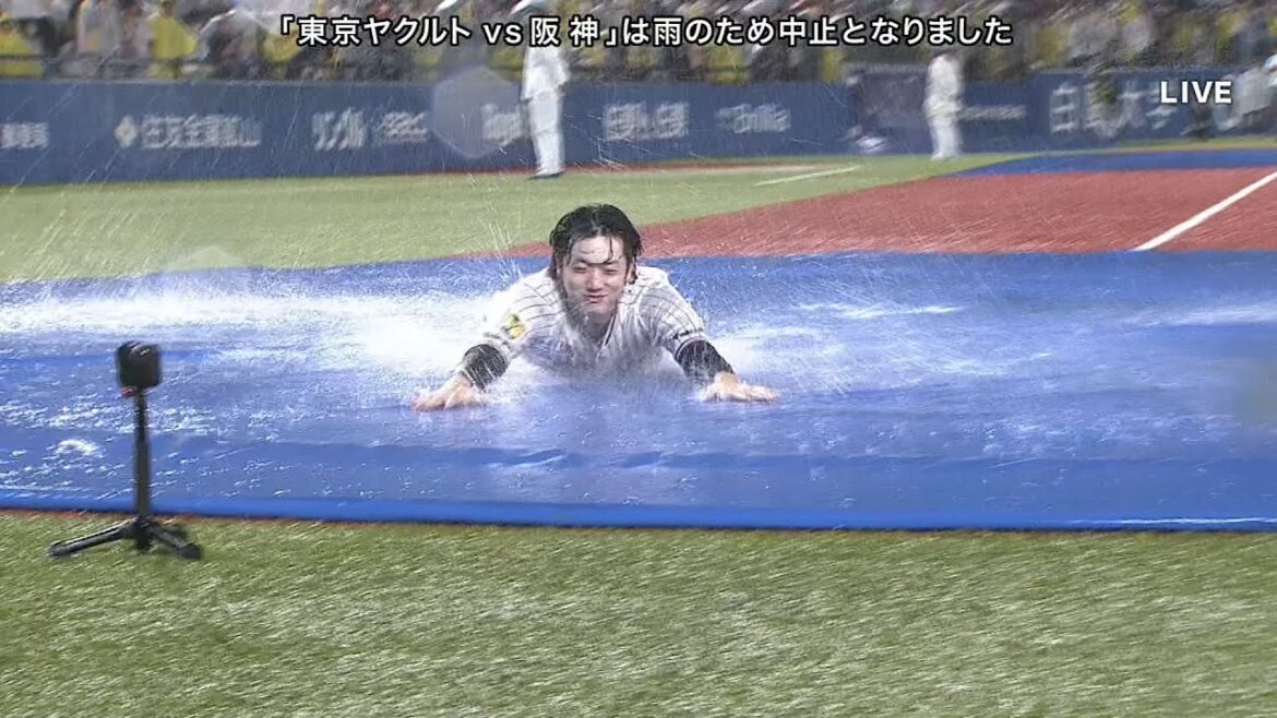 2023年9月22日(金)神宮 ヤクルト vs. 阪神 東京ヤクルトスワローズ 長岡秀樹内野手(21)が阪神ミエセス、ヤクルト丸山に続き、雨天中止のダイヤモンド1周パフォーマンスを行った。 丸山和のパフォーマンスをベンチから見守っていた長岡も、最初は嫌がりながらも?ファンからの長岡コールに応えて登場。一塁へヘッドスライディング、二塁へは足から滑り込み、最後は三塁を回って本塁へずぶ濡れになりながらヘッドスライディング。歓声に笑顔で両手をあげて応えていた。 Tokyo Yakult Swallowsスワローズタイガースパフォーマンスヘッドスライディングヤクルト中止東京東京ヤクルトスワローズ神宮秀樹虎試合野球長岡長岡秀樹阪神雨天 NPBHUB.COM | The Fanbase of Nippon Baseball & Nippon Professional Baseball