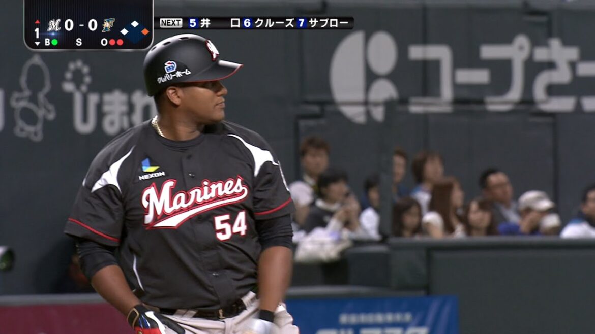初回、4番DHで今季初スタメンのロッテ・デスパイネが打席へ。鋭いスイングでセンター前に抜けるヒットを放った。(4月15日 日本ハム-ロッテ)