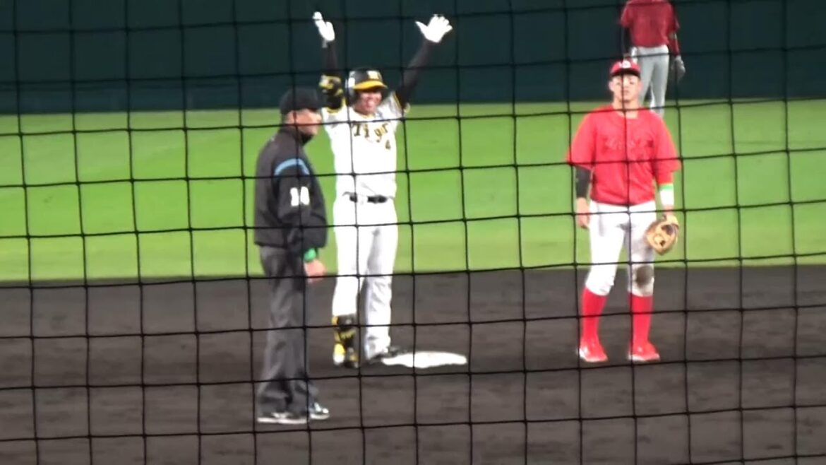 さらに続く1死二三塁で近本光司がセンター前に2点タイムリーヒットを放ち、淡路島コンビの活躍でこの回3点を勝ち越しました。