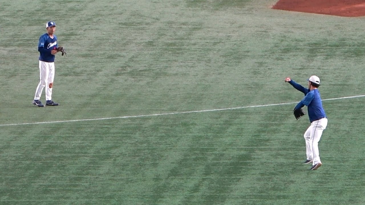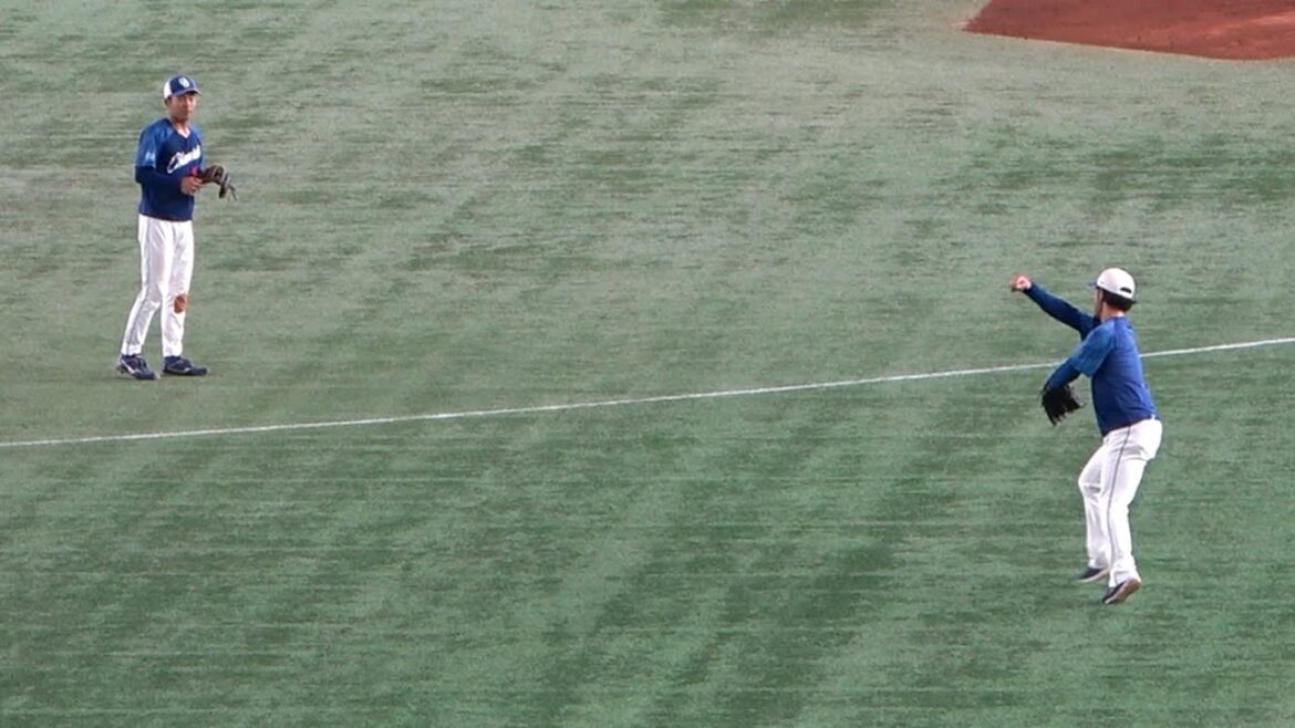 龍空の守備を見て盗むショート祖父江、それに気付いて祖父江にノックを打つ荒木コーチ (2023/09/10)