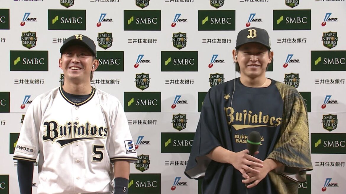 2023年10月29日(日)に京セラドーム大阪で行われた「SMBC日本シリーズ2023」第2戦のヒーローインタビューは、先制タイムリーを放った西野真弘選手と6回4安打無失点の好投をみせ勝利投手となった宮城大弥投手