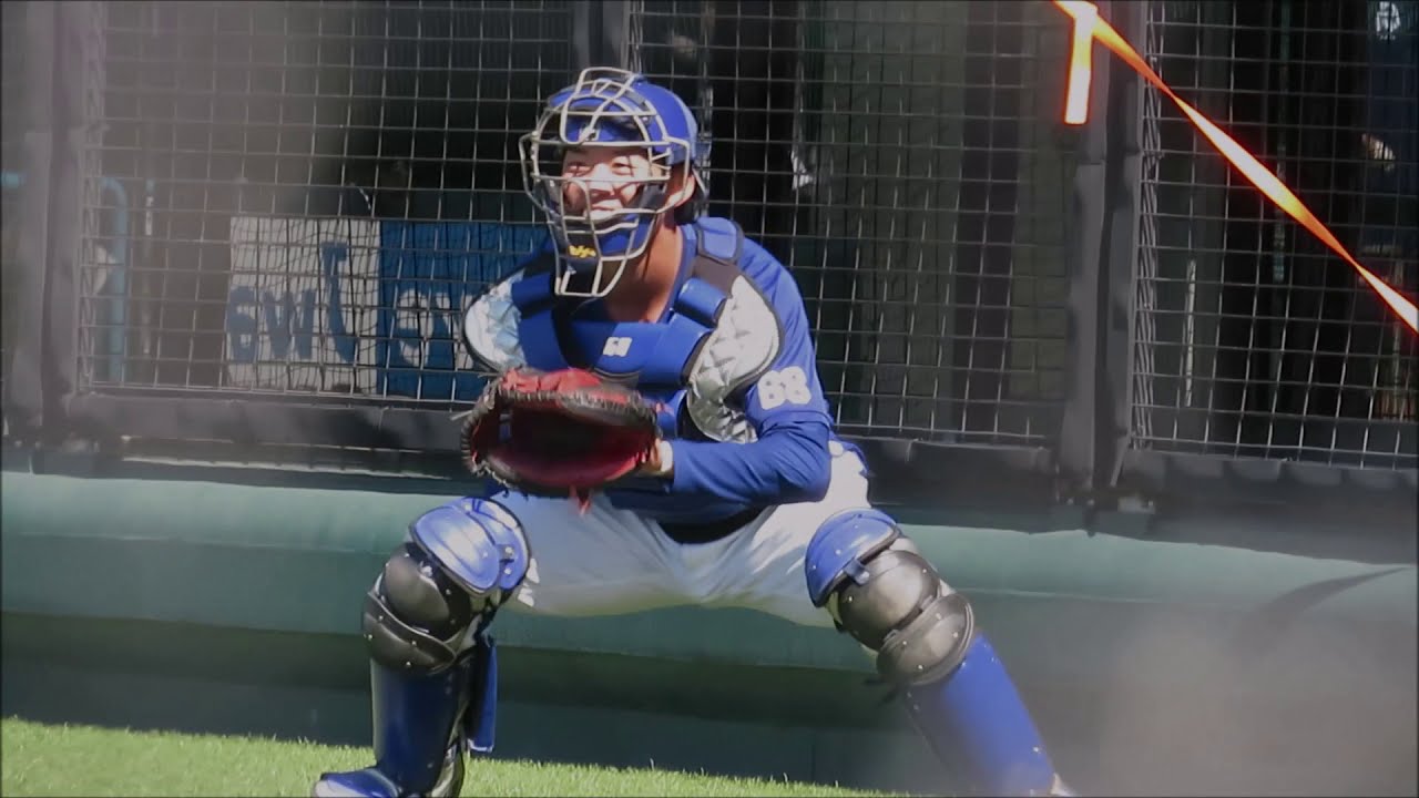 ワンバン捕球の練習をする桂捕手の様子です⚾