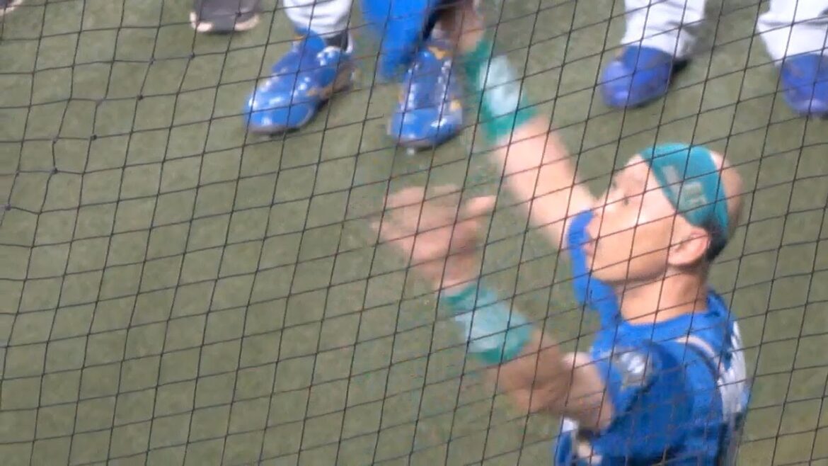 日ハム 森本稀哲コーチの勝利の1本締めを悔しそうに見つめる福谷浩司投手