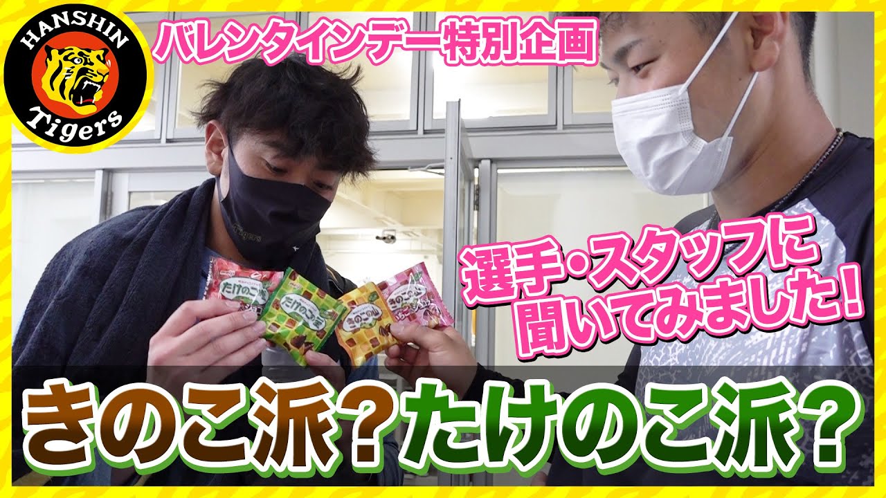 バレンタインデーの特別企画として、タイガースの選手・スタッフに「きのこの山」「たけのこの里」のどちらが好きかアンケートをとってきました!