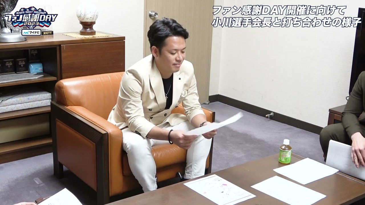 10月某日クラブハウスにて、小川選手会長と球団職員でファン感謝DAYにて実施するイベントについて、打ち合わせを行いました!